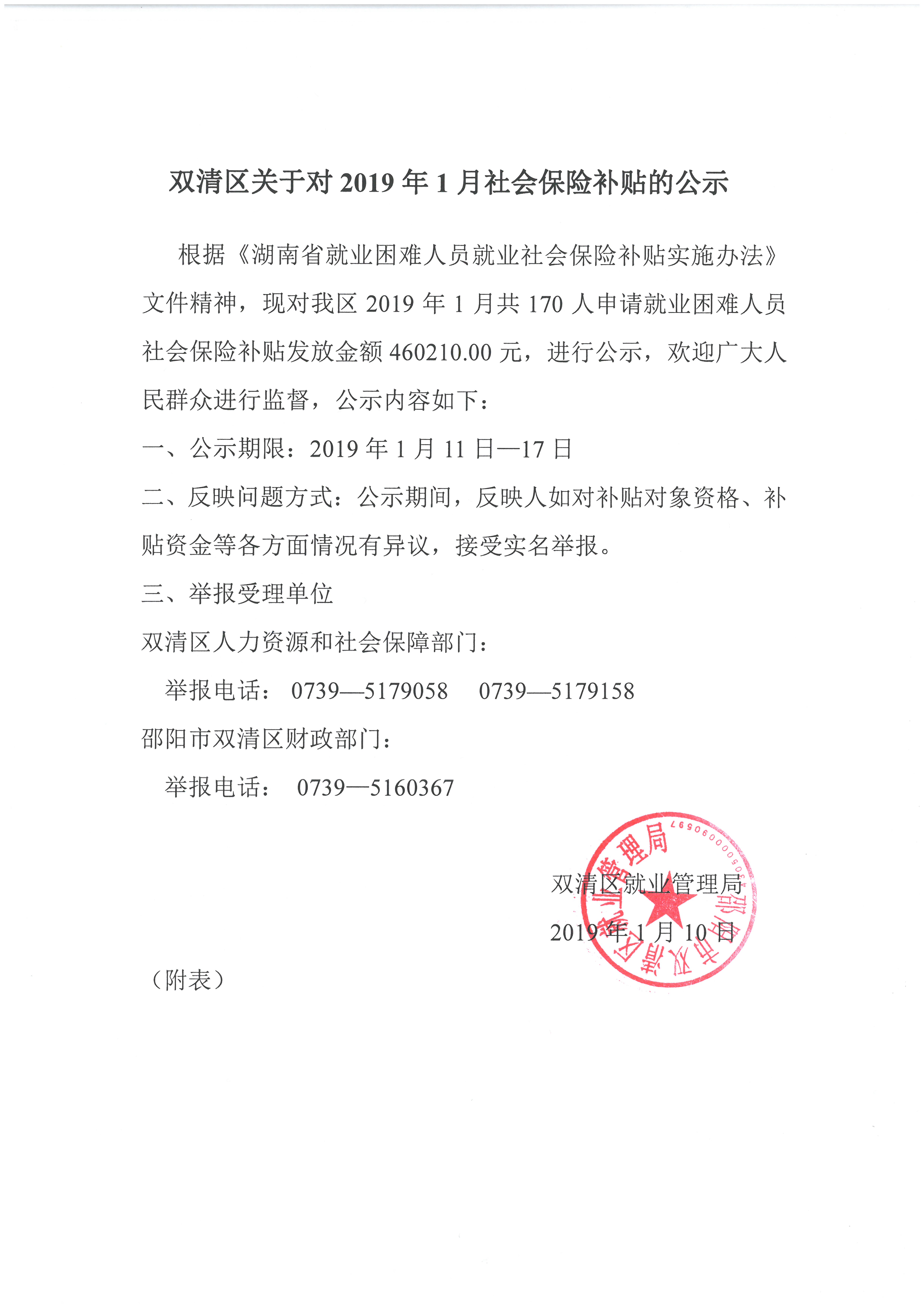 双清区2019年1月社会保险补贴人员花名册详细下载