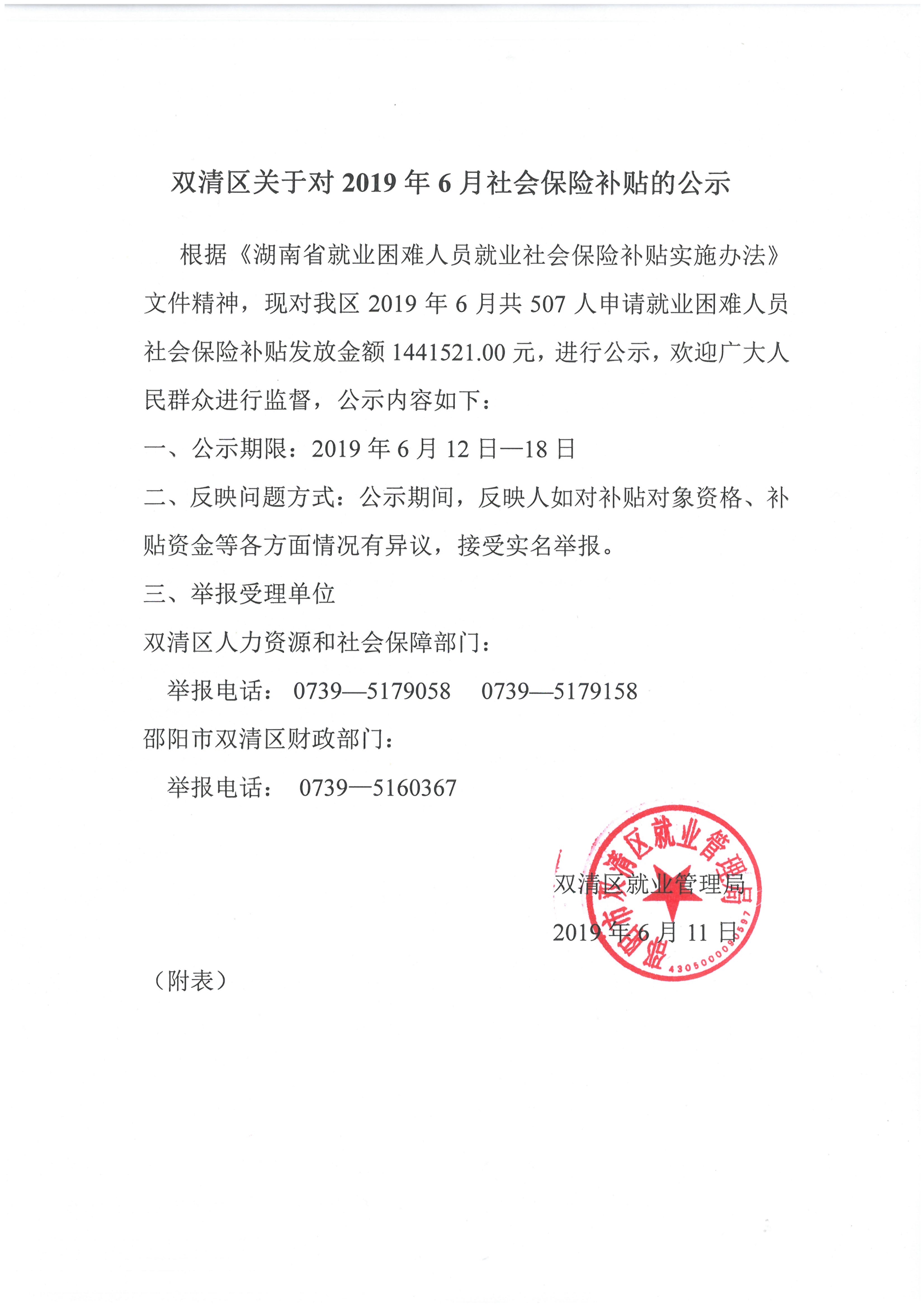 双清区2019年6月社会保险补贴人员花名册详细下载